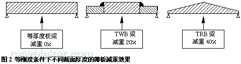 TWB和TRB 的应用都是为了达到汽车轻量化的目的。基于工程力学中薄壁梁承载性能的基本理论,若由等厚度板、TWB及TRB三种板材制成的结构件具有同样的刚度,则其减重效果如图2所示。
