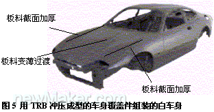 图5为用TRB冲压的车身覆盖件组装的白车身整车,注意到其前部发动机盖板的两侧要求有足够好的刚性,板料厚度为1.25mm,中间部位几乎不承受任何外力,仅需防止高速行驶中可能出现的颤振即可,板料厚度为0.88mm;两侧到中部为连续、光滑过渡,保证了车身的美观和良好的空气动力学特性。