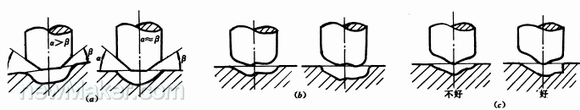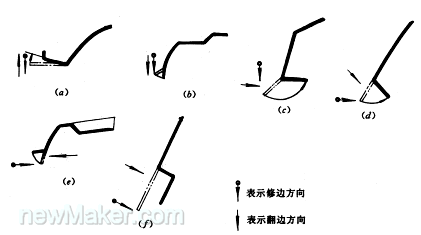 覆盖件的翻边展开不但要有利于拉延,而且要有利于修边和翻边,即尽量造成垂直修边的条件,并使翻边容易进行。图16(a)、(b)、(c)所示覆盖件展开后能垂直修边,图16(d)、(e)所示为水平修边,图16(f)所示为倾斜修边。垂直修边时,翻边展开面与垂直面的夹角应大于50º,否则会使修边刃口过钝,修边边缘过尖,从而影响覆盖件质量。