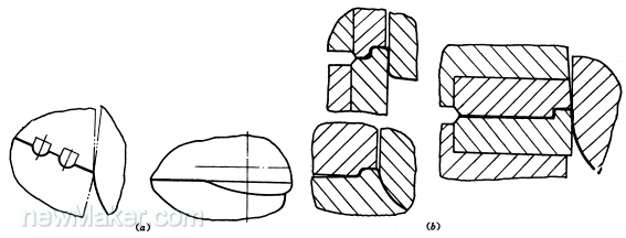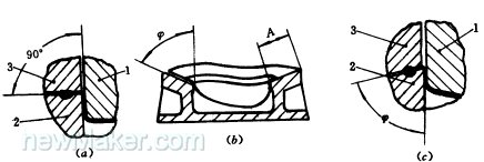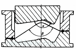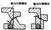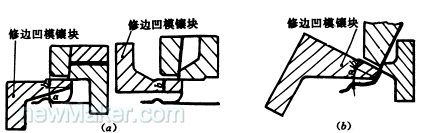 图12所示为水平修边和倾斜修边示意图。修边凹模镶块的刃口宽度b一般取12mm,α角取30º,b局部最小尺寸不小于8mm,α最小为15º。