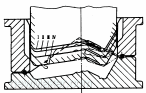 (2)工艺切口。工艺切口一般在拉延过程中切出,废料不分离,和拉延件一起退出模具。工艺切口的最佳冲制时间是在反拉延成型到最深,即将产生破裂的时刻,这样可以充分利用材料的塑性,使反拉延成型最需要材料补充的时候能够获得所需要的材料(见图1-14)。工艺切口也要由试冲决定。