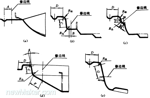 (5)修边线在拉延件侧壁上,如图10(e)所示。采用水平修边或倾斜修边,修边线至凹模圆角半径的距离G是一个变量,它决定水平修边凹模镶块的强度。
