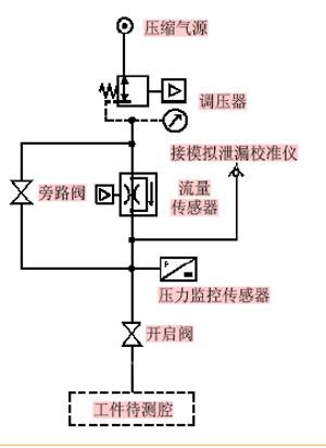 图1是一种质量流量法泄漏检测的工作示意图,其检漏过程为:调压器调制到规定压力;关闭旁路阀和传感器阀,打开充气阀和储气罐阀,向储气罐充气;当压力监控传感器显示已达到额定充气压力后,关闭充气阀,打开旁路阀和开启阀,从而向工件充气;在被测件内腔经充气和一段时间的稳定后,关闭旁路阀,打开传感器阀,进入测量阶段;若被测工件存在泄漏,则在测量阶段由于工件内腔相对储气罐阀的压力差就会导致气体从罐向工件的流动;最后,通过流经传感器的气流,利用质量流量法计算出该被测件的泄漏率。图2则形象地反映了上述测量系统的检漏过程。