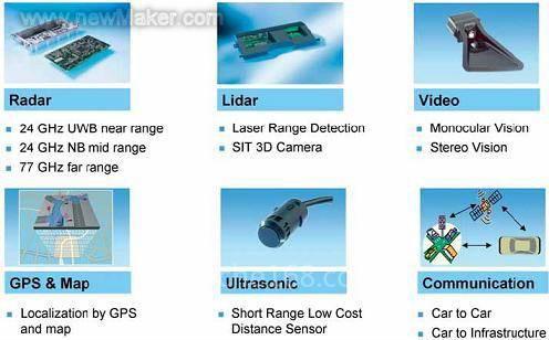 其他基础设施如交通信号、转弯或山坡等信息可以通过地图来获得。超声波传感器用于低速情况,比如停车,同时不需要高探测范围。而且内部数据可以收集起来提供给其他车辆。通过车对车通信进行数据传递,来监测车流密度。
