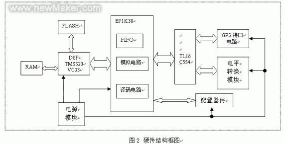 通过对系统进行功能分析,导航计算机需要完成数据采集、数据处理和数据输出功能。数据输入部分主要完成各种传感器输出数据的采集;数据处理部分主要完成数据滤波、微型惯性测量元件的误差补偿和初始对准、卡尔曼滤波以及进行导航参数解算等等;数据输出部分主要负责导航参数输出,应用于定位导航或者下一步需要的输入。由于采用多种传感器进行信息融合,需要较多的外围通信接口,同时,外部传感器数据输出通信主要通过符合RS-232标准的异步串行通信口进行,如果和中央处理器直接相连,大量的中断响应必将影响到CPU的处理速度,目前各种MCU、MPU可以提供的串口资源也是有限的。传统的设计很多都是采用PC104作为系统的中心处理器,PC104体积大,价格高,不利于系统的小型化、低功耗和低成本的实现。因此,本设计考虑采用DSP+FPGA+TL16C554的方案进行设计,其中 DSP完成主要的导航参数计算,利用TL16C554进行外部通信接口的扩展,FPGA完成串口的模拟以及相应的逻辑控制以保证三者之间通过数据线的高速通信,提高系统的运行效率和运算精度。