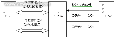 TL16C554的地址线 A2~A0、数据线 D7~D0 分别和 DSP 的地址总线 A2~A0、外部数据线 D7~D0直接相连,而片选信号CSA ~CSD 、读写信号IOR / IOW 以及中断信号INTA~INTD 则接入 FPGA 并由 FPGA处理。电路中使用FPGA一方面可以对 UART 的地址灵活配置,另一方面也可以灵活生成 UART 的选通和读写信号,从而增强系统的灵活性,方便系统调试。
