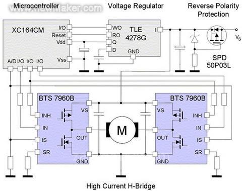 BTS7960的路径RDS(ON)在25℃时为17毫欧,其p沟道和n沟道MOSFET采用不同的工艺制造,从而保证了高侧和低侧开关的快速开闭,还可避免出现交叉电流。这种设计有别于使用电荷泵、最大开关频率有限的大多数桥,因此有助于实现高频PWM控制方案和一些新的功能,如“软”开/关窗户,并具有很好的EMI性能。