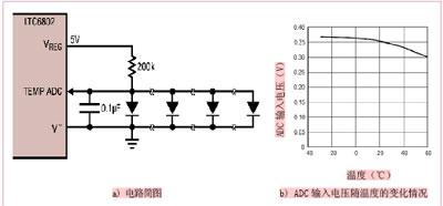 LTC6802的核心部分是一个12位ΔΣ ADC(增量累加模数转换器)。在该ADC之前布设了一个15通道多路复用器。这15个通道用于12个电池电压测量和3个温度测量。在温度通道中,有一个通道专门用于测量芯片本身的晶片温度,另两个通道则用于外部温度传感器。图1和图2为采用LTC6802进行温度测量的电路实例,其中图1给出的是一款基于准确热敏电阻的传感器(用于SOC计算),图2给出了一款非常简单的二极管型“热点”检测器。