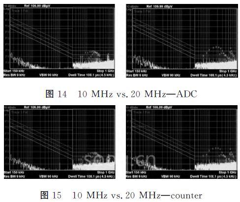 在10MHz和20MHz时钟上对比,ADC最高峰值分别为35.827dBμV、43.517dBμV;counter的最高峰值为35.899dBμV、43.271dBμV。可以得出频率越高,干扰强度越大。但就两类程序横向对比来看,结果基本上一致。另外还发现60~300MHz和550~650MHz两处集中的干扰频谱,可见电源处的干扰在高频附近比较明显。