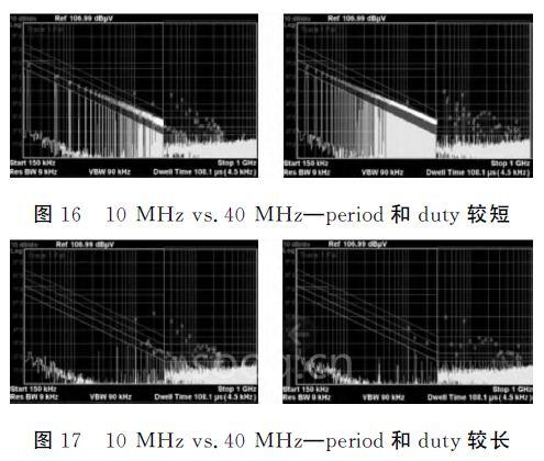 从图16中的干扰密度可看出时钟对电磁干扰影响程度。在图17中,由于period和duty较长,测试结果相差不大,此时时钟频率变成次要因素,主要因素取决于输出引脚处高低电平变化周期长短。