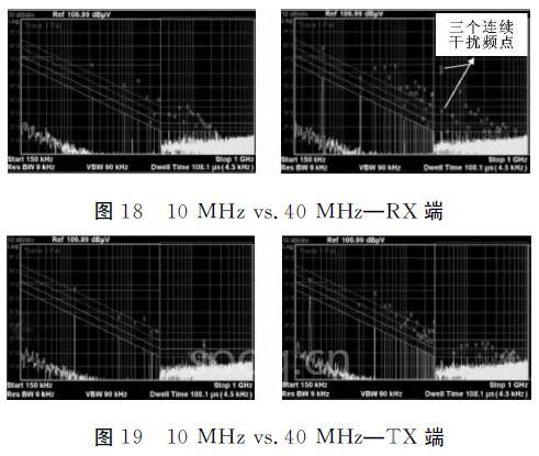 从图16~19中观察,随着时钟频率变大,TX和RX端口的传导辐射强度也变大。对于RX端口,10/40MHz频点附近的干扰密度比较大,且在40MHz时候现象更明显,捕捉到连续三个频点(图18右侧标注),分别是39.060 MHz(71.063dBμV)、39.360MHz(67.447dBμV)、40.020MHz(39.171dBμV),两个时钟下的峰值都在70~85dBμV 之间,但一般都在10MHz以下,应该是受低频某一频点的影响较明显。
