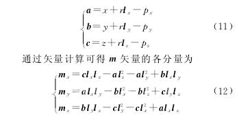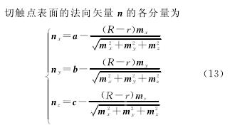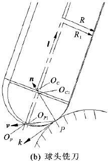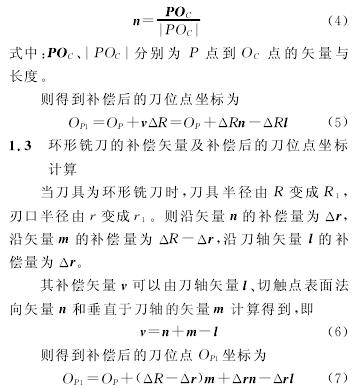 由于刀轴矢量不变,二维刀具半径补偿的实质只是将切触点的坐标按其表面 的法向矢量 进行偏置,再对刀具中心点编程;而在 3D 刀具补偿中,由于刀轴矢量不断变化,刀位点的补偿矢量与二维刀具半径补偿不同,是通过切触点表面的法向矢量、刀具方向和刀具几何尺寸计算得出。下文分别对五轴数控加工中常用的端铣刀、球头铣刀和环形铣刀进行矢量分析,计算得出3D 刀具补偿的补偿矢量及补偿后的刀位点坐标,见下页图1。图 中:P 为 切 触 点,OP(x,y,z)为 刀 具 中 心点,即 刀 位 点,OC为 刀 心 点,O1为 刃 口 圆 心,P(px,py,pz)为切触点,R 为刀具半径,r、r1均为刃口半径,n(nx,ny,nz)为 切 触 点 表 面 的 法 向 矢 量,l(lx,ly,lz)为刀轴矢量,m(mx,my,mz)为垂直于刀轴方向的矢量,v(vx,vy,vz)为补偿矢量,以上矢量均为单位矢量,k为路径切线。