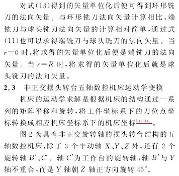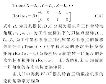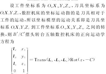 通过建立非正交摆头转台五轴数控机床各运动轴坐标与刀位数据之间的关系,基于逆向运动学求解方法,可以得到非正交摆头转台五轴数控机床平动轴坐标与转动轴坐标。