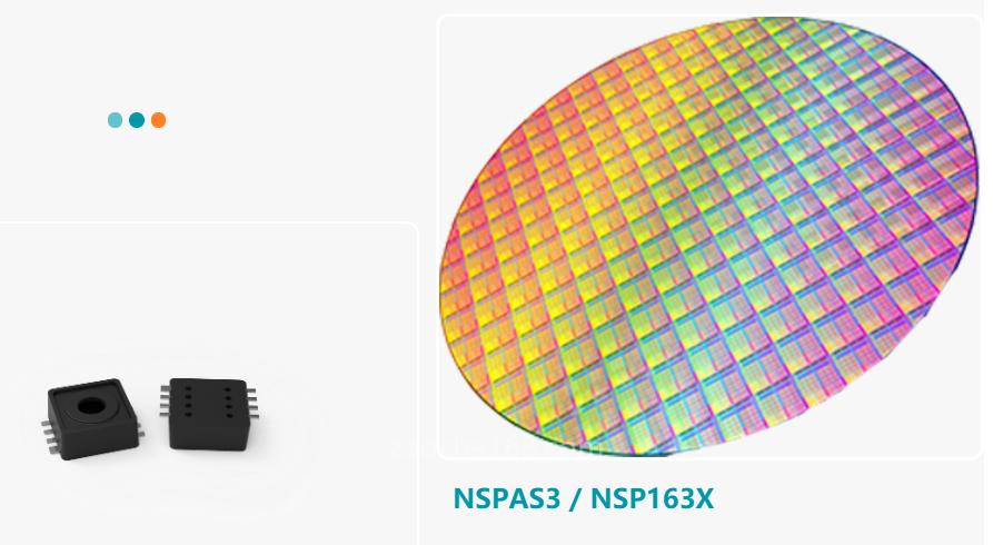该系列MEMS晶圆芯体(NSP163x)以及合封产品(NSPAS3)主要应用于汽车进气歧管压力检测以及摩托车进气通路压力检测,也可用于混动/新能源真空助力系统(VBS)和电池包压力检测,在工业控制,气象站等应用上也有它的用武之地。