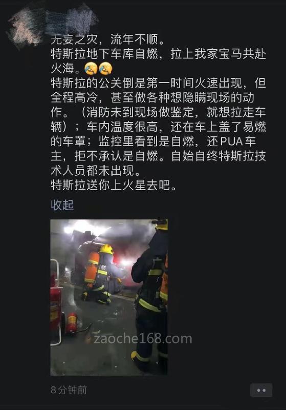 之后一位宝马7系车主在个人社交平台上发文表示,因为自己的车临近特斯拉,也因此受到波及,“无妄之灾,流年不利。特斯拉地下车库自燃,拉上我家宝马共赴火海。”