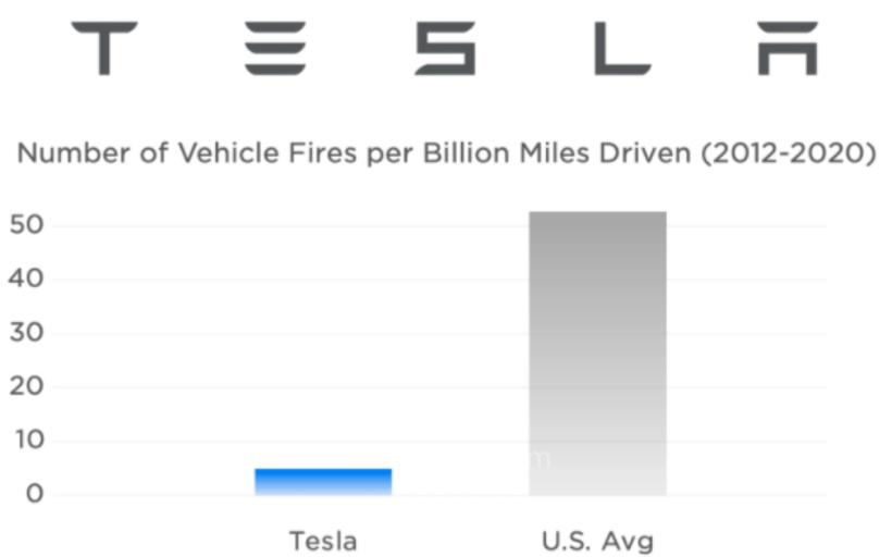 具体来看,从2012年到2020年,美国国家消防协会和美国交通部的数据显示,全美每行驶1900万英里就有一辆汽车发生火灾。而特斯拉发生起火事件的频率是2.05亿英里/次。