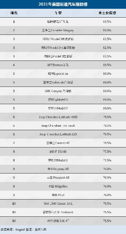 这是福特汽车公司连续第二年在Kogod美国制造汽车指数中位居榜首。2020年福特Ranger排名第一,但今年该款车下降到了第16位,因为美国和墨西哥产零部件在其车辆中所占比例从70%降到了45%。
