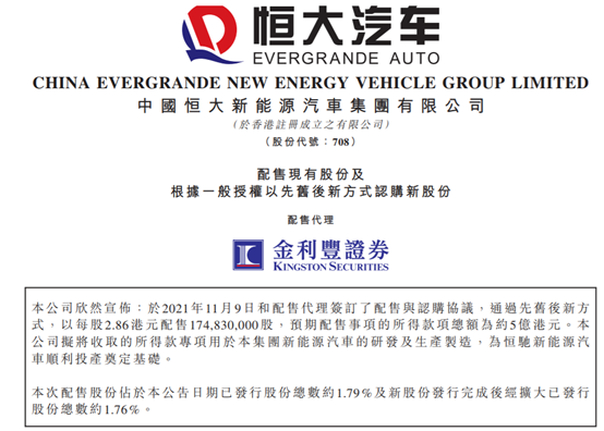 11月10日,恒大汽车发布公告称公司于11月9日与配售代理签订了配售与认购协议,通过先旧后新的方式以每股2.86港元配售1.75亿股,预期配售事项的所得款项总额为约5亿港元。这些所得款将用于恒大新能源汽车的研发及生产制造,为恒驰新能源汽车顺利投产奠定基础。