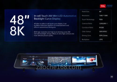 在大尺寸方面,TCL华星打造了48”超大尺寸车载显示,约1.4米长,横贯整个A柱,集仪表、中控、副驾驶娱乐功能于一体,结合R4200曲面设计,可与汽车内饰设计更好的融为一体,营造沉浸式的环绕体验。车载行业最高8K1K分辨率、首发5096分区 AM Mini-LED背光、100%NTSC,带来百万超高对比度的极佳的驾驶视觉享受。同时,低反射率也进一步降低,使其在高强光下依然可以保持极佳的可阅读性,确保行车安全。