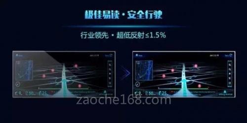 低反射率可使其在高强光环境下的仍保持极佳易读性,确保安全行车;一体黑使其在息屏状态与内饰融为一体,在黑夜按下启动的时候才可以看到屏在哪里,达到真正的息屏美学。