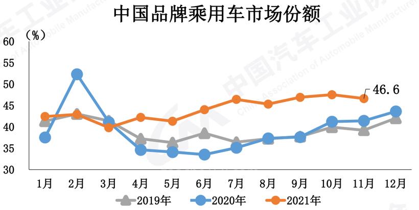 1-11月,乘用车市场累计销量达到1906万辆,同比增长7.1%。其中,中国品牌乘用车共销售840.6万辆,同比增长25.1%,占乘用车销售总量的比重为44.1%,占有率比2020年同期提升6.4个百分点。