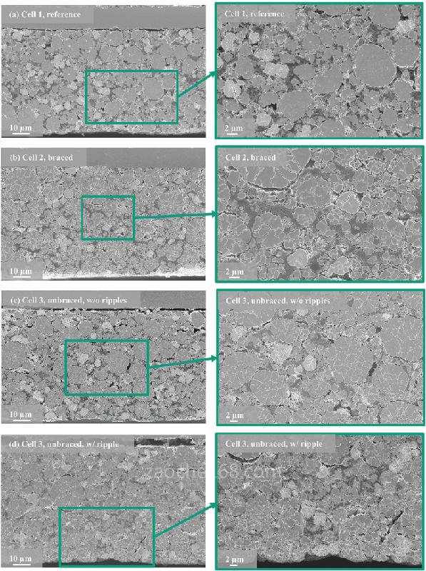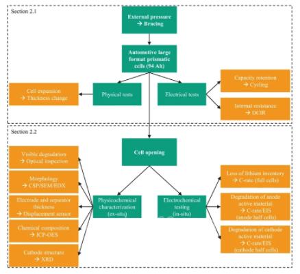 在循环过程中,由于正、负极的暂时和永久性膨胀和收缩,低减压(low decompression)可能导致电化学堆内部元素之间结合不充分。目前的研究分两步进行。第一部分提供了老化实验的电生理结果,在这些实验中,电池在不同的支撑条件下运行7000次以上。第二部分利用各种事后分析技术,对电芯退化现象进行了研究。
