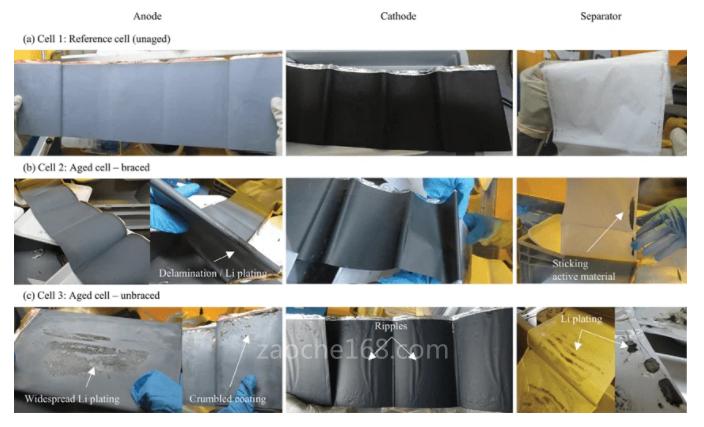 电芯1(参考电芯)未表现出明显退化,例如沉积、剥离或裂缝。电极表面看起来很均匀。电芯2(有支撑老化电芯)仅出现轻微的退化。除了靠近实际采集的几个位置外,电极似乎具有均匀性。电芯3的电极和隔板(老电芯、无支撑)表现出明显的退化。电芯1的负极表面形态表现为,石墨表面有一层均匀的Al2O3颗粒涂层。