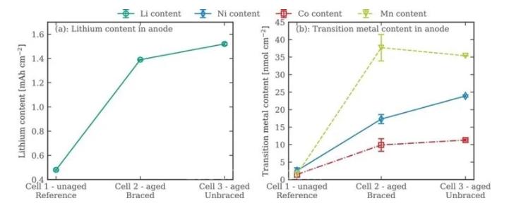 然而,电芯2(有支撑)出现额外沉积点,可能代表电解质分解产物。电芯3(无支撑)的负极表面有许多涂层,可归因于所覆盖的锂。只有在电芯3这种无支撑的老电芯中,才能观察到覆盖层退化。在这些地方与石墨颗粒发生直接相互作用,导致锂电镀。