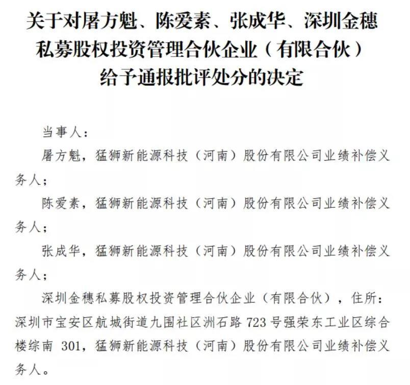 同日,深圳交易所还对屠方魁、陈爱素、张成华、金穗投资给予通报批评处分。原因是*ST 猛狮”于 2016 年通过发行股份的方式购买的华力特100%股权,当中有华力特2018年净利润不达标则补偿的补充协议。然而,原承诺的华力特2018年净利润不低于 13182 万元,实际却亏损11054.92 万元,未完成 2018年业绩承诺。截至目前,屠方魁、陈爱素、张成华、金穗投资仍未履行业绩补偿承诺。