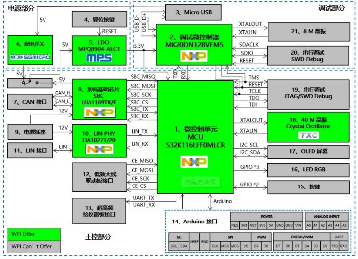 本方案的核心是NXP旗下的32位通用型MCU——S32K116。该产品基于ARM® Cortex®-M4F和ARM® Cortex®-M0+内核,集成了128KB闪存、CAN/CAN-FD控制器、遵从SHE指标的安全模块,工作电压2.7V到5.5V,符合AEC-Q100安全标准认证。此外,该芯片还具有丰富的外接功能、灵活的可扩展性以及极高的安全性,可为汽车应用提供强大的支持。