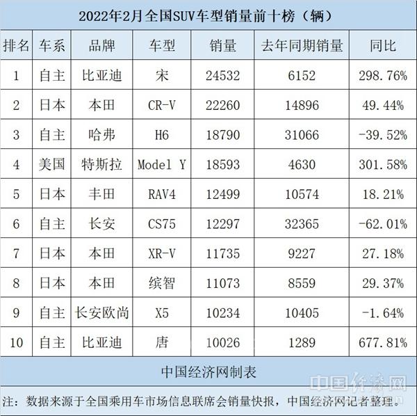 2月,国内SUV市场“风云突变”。一方面是比亚迪宋首夺SUV月度销冠、比亚迪高端车型——唐携手入围前十;同时,明星车型特斯拉Model Y高奏凯歌,销量同比翻三番。另一方面,“神车”哈弗H6销量“罕见”不足2万辆,跌至榜单季军;长安CS75更是滑落至榜单下半区……