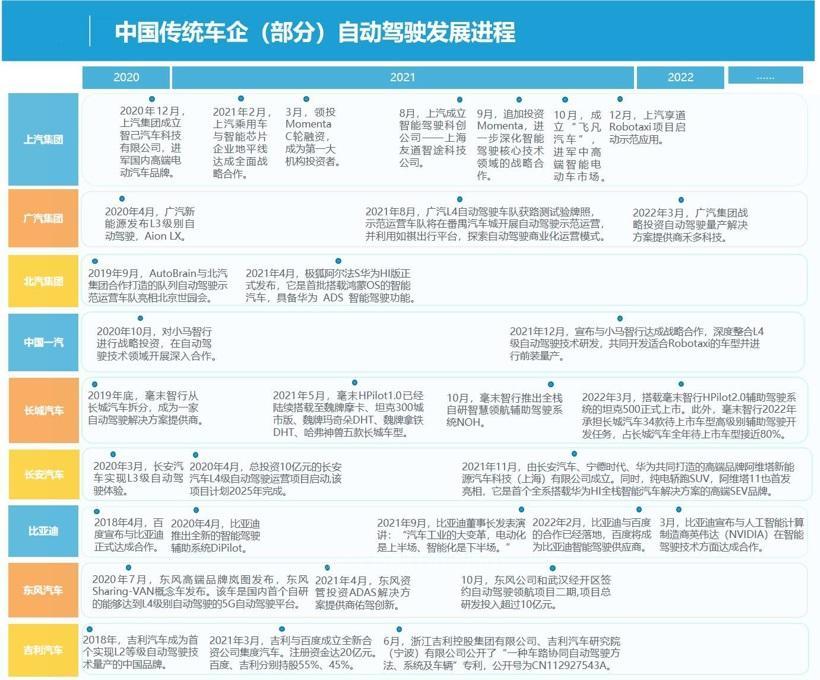 根据股权性质,选择三家国资委控股的车企,中国一汽、长安汽车与东风汽车;三家地方车企,上汽集团、广汽集团和北汽集团;以及三家民营的代表车企,吉利汽车、长城汽车和比亚迪,将其作为传统车企中的代表性企业,梳理他们在自动驾驶领域的布局后发现,传统车企对于自动驾驶能力的搭建已经成为必选项。