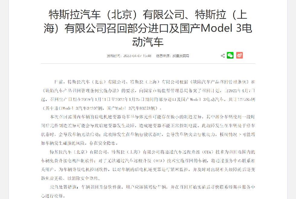 4月7日,据国家市场监督管理总局官网消息,特斯拉汽车(北京)有限公司、特斯拉(上海)有限公司向国家市场监督管理总局备案了召回计划,决定自2022年4月7日起,召回生产日期在2019年1月11日至2022年1月25日期间的部分进口及国产Model 3,共计127,785辆,其中进口Model 3汽车34,207辆,国产Model 3汽车93,578辆。