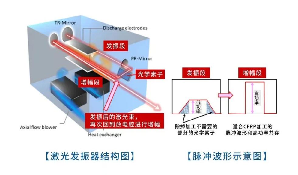 配备Integrated-MOPA[3]方式的三轴正交型[4]二氧化碳激光发振器,将振荡器和增幅器集成在同一个框体中,通过简单的结构发出适于CFRP加工的激光,解决了迄今为止难以实现的CFRP的精密加工的问题。