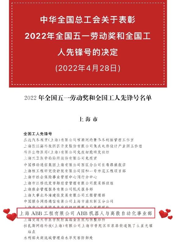 为进一步增强新时代工人阶级的自豪感和使命感,营造劳动光荣的社会风尚和精益求精的敬业风气,4月28日,中华全国总工会公布了2022年全国五一劳动奖和全国工人先锋号名单,上海ABB工程有限公司ABB机器人与离散自动化事业部荣获 “全国工人先锋号”光荣称号!