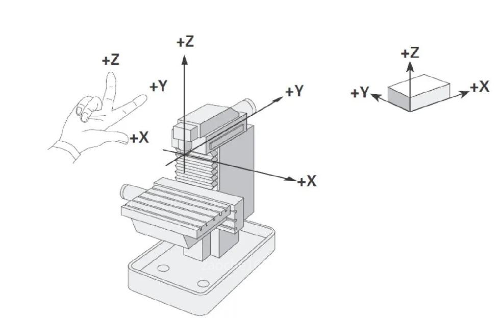 X轴坐标平行于工件夹面的,远离工件的方向为正方向,Y轴正方向可根据X、Z轴的运动方向,用右手笛卡儿坐标系来确定。旋转运动方向以顺时针为正方向,根据右螺钉进入工件的方向确定。