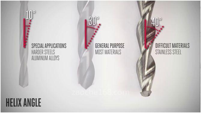 对于绝大多数的材料来说30°的螺旋角度是个非常好的选择。但是对于需要排屑更好,切削刃的强度更高的环境,可以选择螺旋角度更小的钻头。对于难以加工的材料比如说不锈钢,可以选择螺旋角度更大的设计来传递扭矩。