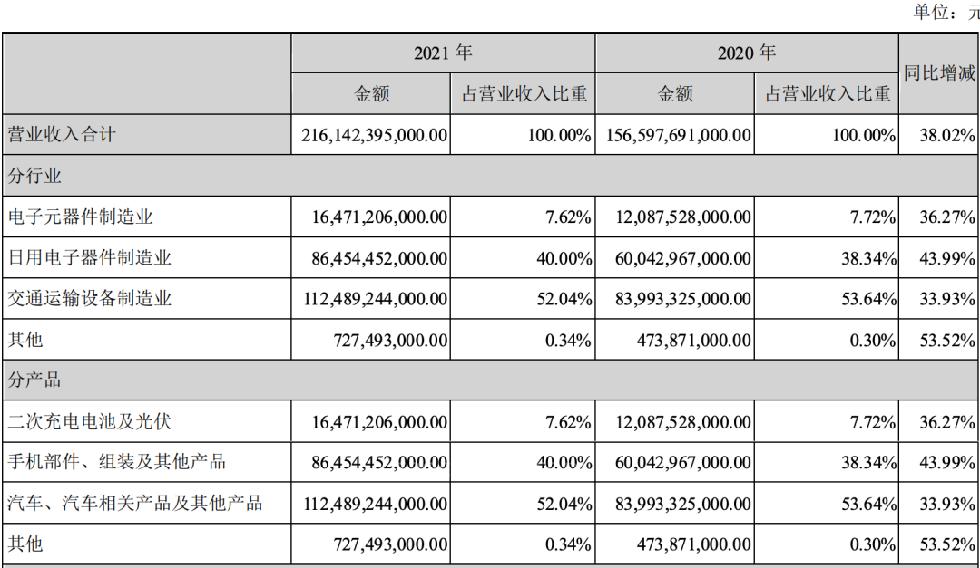 当然,撑起比亚迪股价和市值的不仅仅是汽车业务。除了汽车业务之外,比亚迪还拥有手机部件及组装业务、二次充电电池及光伏业务两大业务板块,2021年三大板块占公司总收入的比例分别为40%、8%。从各大业务板块发展来看,2021年比亚迪总收入为2161.42亿元,同比增长38.02%。其中,汽车、汽车相关产品及其他产品业务的收入为1124.89亿元,同比增长33.93%;手机部件、组装及其他产品业务的收入为864.54亿元,同比增长43.99%;二次充电电池及光伏业务的收入为164.71亿元,同比增长36.27%。