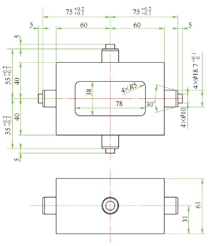 图1为十字体零件三维模型,零件整体为中心对称结构,材质为20CrMnTi。图2为十字体零件加工尺寸要求(局部)。零件四周有4个φ18.27h4枢轴,枢轴相互之间垂直度、同轴度均为0.01mm,枢轴与零件侧壁垂直度为0.01mm。枢轴要求局部渗碳淬火,淬火后硬度58~63HRC,设计精度高,材料难加工。零件下料尺寸为φ220mm×66mm,加工过程中金属去除率达到91%,材料去除量大,加工变形不易控制。
