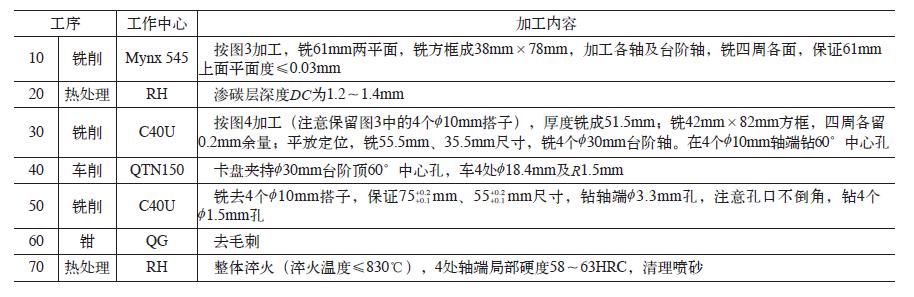 零件四周侧壁加工后的最终尺寸为110mm×70mm,为了控制渗碳区域,将中间件四周侧壁尺寸粗加工成120mm×80mm,4个枢轴尺寸粗加工成图片mm。粗加工尺寸要求如图3所示。渗碳处理后,通过半精加工,将中间件四周侧壁尺寸加工成111mm×71mm,保证四周侧壁渗碳区域被完全去除。粗加工和半精加工工艺流程见表1。半精加工尺寸要求如图4所示。