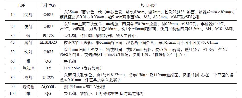 考虑到粗加工后,宽82mm、深7mm开挡及2处15°斜面尚未加工,依然存在大量余量,加工过程中依然存在零件变形风险。同时,φ23mm孔、φ18N7孔、φ14N7孔及4个R40mm圆弧面(见图1右上1/4圆弧)等部位的粗加工同样存在零件变形风险。为了使变形量在加工4个枢轴顶端60°中心孔之前完全消除,需将上述部位在平面磨床磨削两平面之前进行半精加工。针对非公差尺寸,在不影响后续加工的前提下,可以在平面磨床磨削前加工完成。为了便于平面磨床加工,在半精加工时选择将51mm上下两平面均留0.2mm磨削余量[3]。精加工工艺流程见表2。