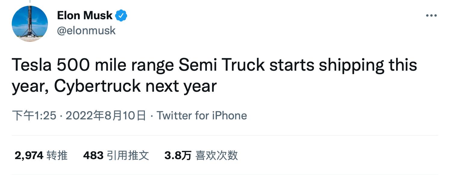 马斯克在这条推文中写道:“特斯拉500英里续航的Semi Truck将在今年开始出货,Cybertruck则是在明年。”