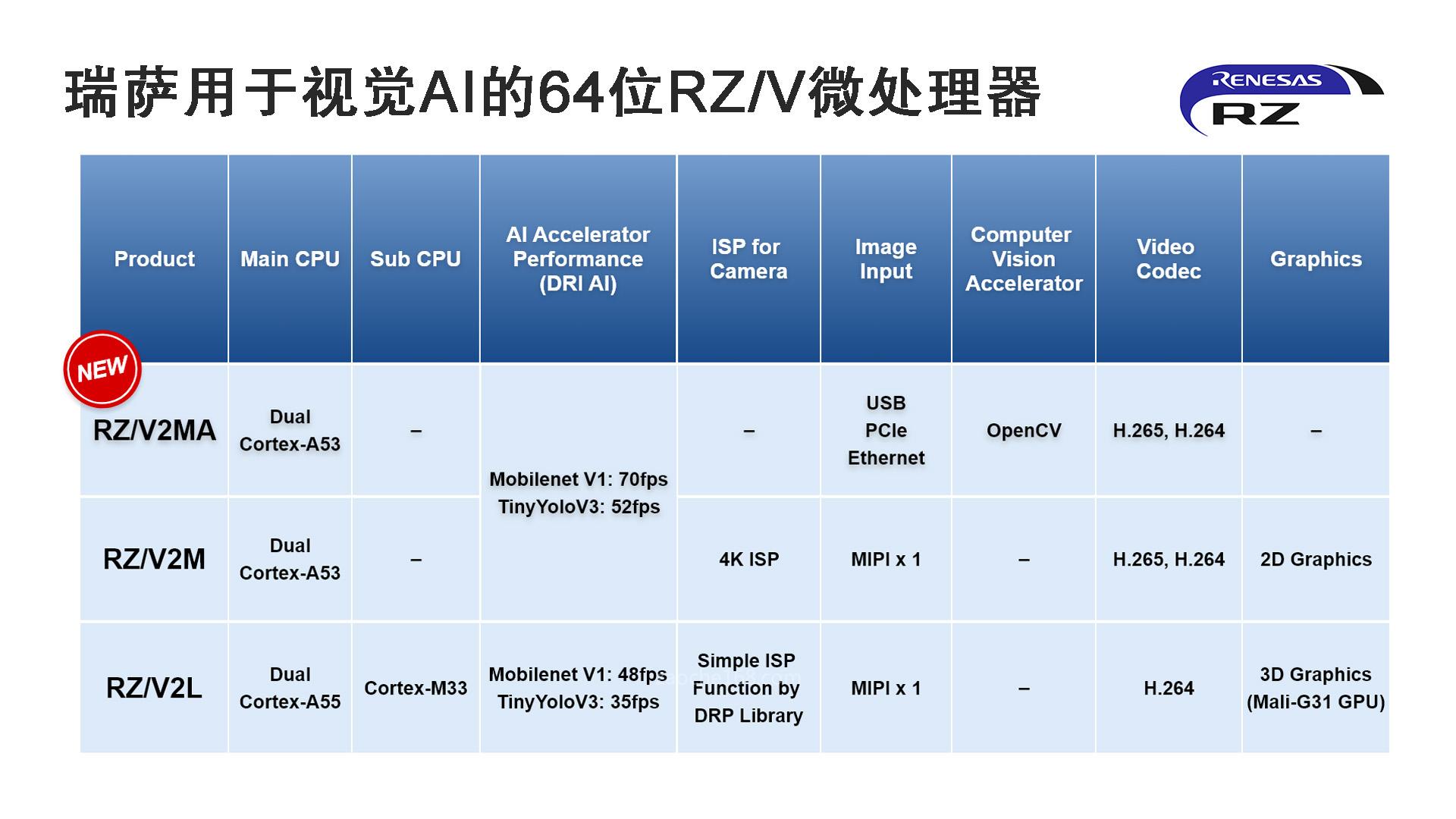 2022 年 9 月 29 日,中国北京讯 - 全球半导体解决方案供应商瑞萨电子(TSE:6723)今日宣布,推出一款能够处理多个摄像头图像数据的全新RZ/V2MA器件,进一步扩充其RZ/V系列微处理器(MPU)产品线,并为视觉AI应用带来新水平的高精度图像识别能力。该新器件集成了两个64位Arm® Cortex®-A53内核,能够以1GHz的最高工作频率提供高计算性能;具备专有的低功耗DRP-AI(动态可重构处理器)加速器,可以以1 TOPS/W(每秒百万次操作/瓦)级的性能处理图像数据。