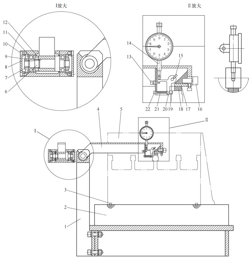 1—支架 2—底座 3—销 4—翻盖式支架 5—缸体 6—轴 7—防尘盖 8—端盖 9、12—圆螺母 10、16、22—螺栓 11—轴承 13—杠杆限位块 14—百分表 15—弹性螺钉 17—角铁 18—橡胶垫块 19—钢球 20—杠杆 21—弹簧