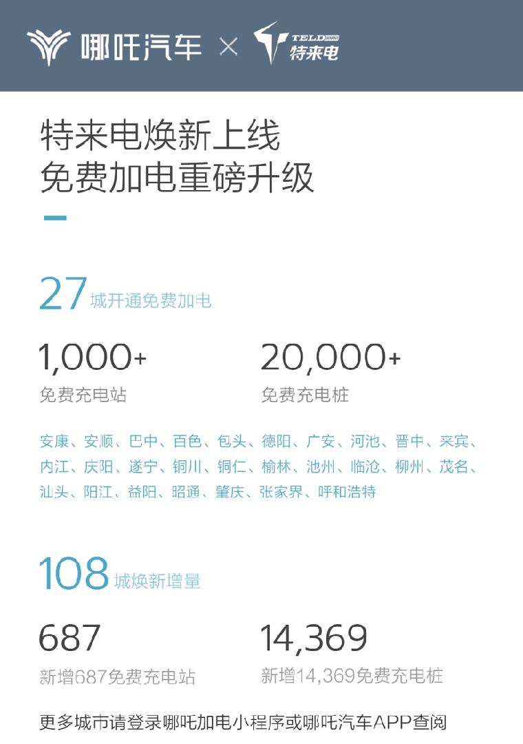 此次,哪吒汽车在200城免费充电布局的基础上,为包头、晋中、益阳等27座城市开通免费加电,累计新增1000+座免费充电站,20000+根免费充电桩。同时,在已经实现免费充电的城市中,哪吒加电实现108城焕新增量,累计新增687免费充电站,14369根免费充电桩。新增27座免费充电城市后,哪吒汽车的免费充电网络布局整体将达到227个城市,覆盖全国34个省级行政单位,共有3400+座免费充电场站,超过45000根免费快充桩为用户的出行提供便利。