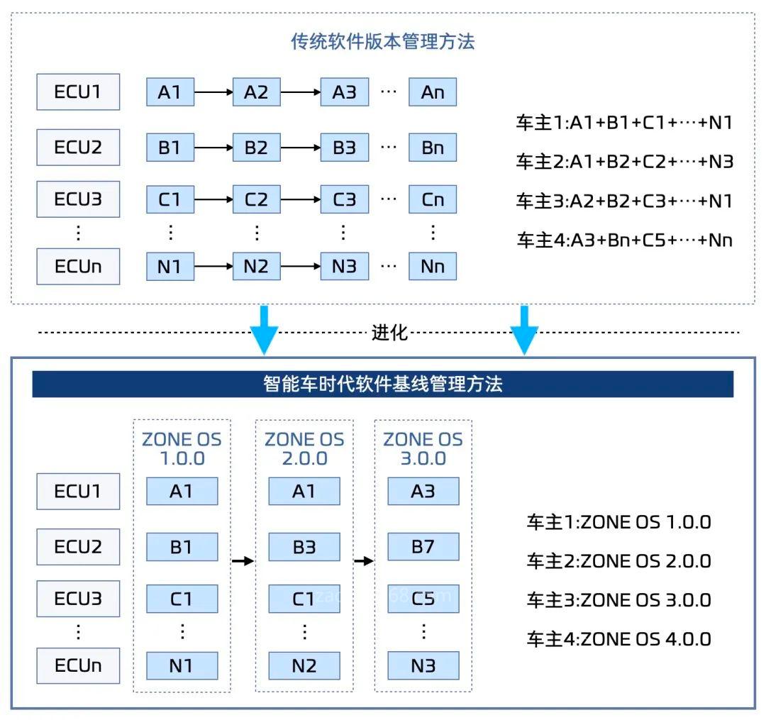 零束OTA基于整车功能基线、服务订阅对所有控制器纵向软件版本进行统一管理,对比于传统基于独立控制器横向软件版本管理的方式,解决了控制器软件版本碎片化、控制器之间软件版本依赖极难维护、相同配置车辆用户体验迥异等问题。