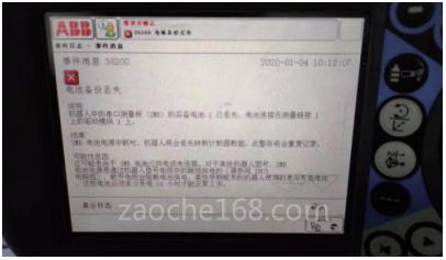 一台ABB机器人应用于火焰喷涂表面处理领域,如图1所示。设备开机后机器人示教器上显示“SMB串口测量板后备电池已丢失,机器人转数计数器数据丢失”,机器人无法执行动作,报警信息如图2所示。