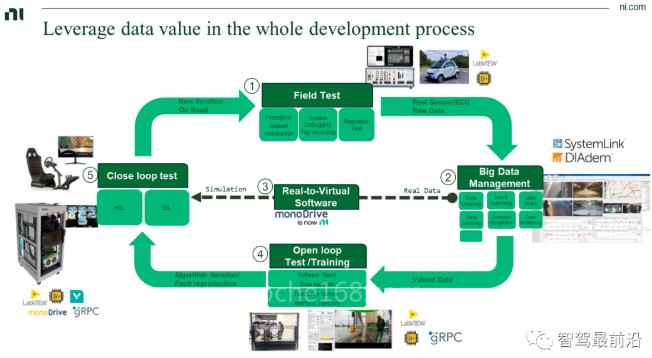 闭环测试通常包括软件在环(SIL)和硬件在环(HIL)。在软件在环这块,NI的方案是利用monoDrive平台提供一个可以实现在云上批量部署的环境。在硬件在环这块,NI的方案是利用PXI平台,同时利用NI在摄像头、车载总线,及数据同步等方面的优势实现多种类型传感器的带有数据注入功能的闭环系统。