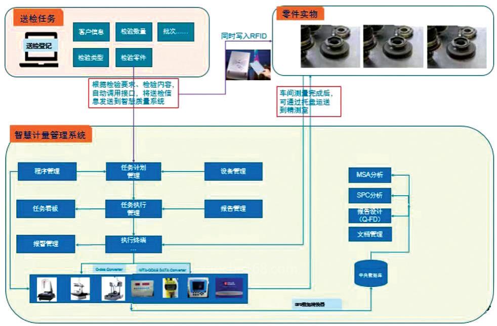 实时智能质量控制系统及方法从零部件质量送检上线,再到检测完成,数据跟踪,系统化查询,形成一个闭环,从而使产品的质量跟踪在每一个环节都形成数据采集与控制点。系统采用数据采集与统计分析相结合的方式,实时记录零部件检测的数据信息,从基础生产数据中提取管理部门需要的各种数据,进行各种查询及更高要求的统计分析。这样操作员既可以看到前台数据,又可以了解后台信息,同时掌握零部件实时质量信息,严格检测机床CPK数据,将事中控制与事后分析做到完美结合,如图1所示。