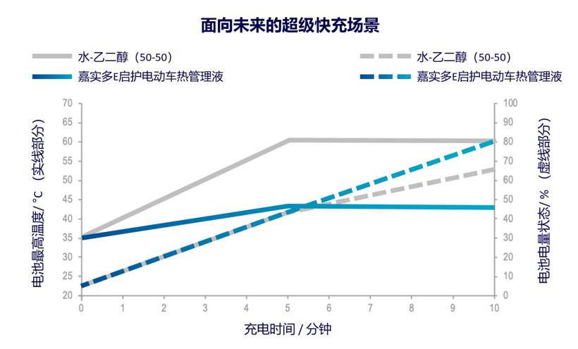 同时,对比最终电池电量,可以发现采用水-乙二醇间接冷却方式进行充电,由于温度过高触发了电池管理系统的管理规则,会放缓充电功率从而无法在特定时间内达到充电目标;而采用嘉实多E启护电动车热管理液则可以保持温度正常,达到充电目标。